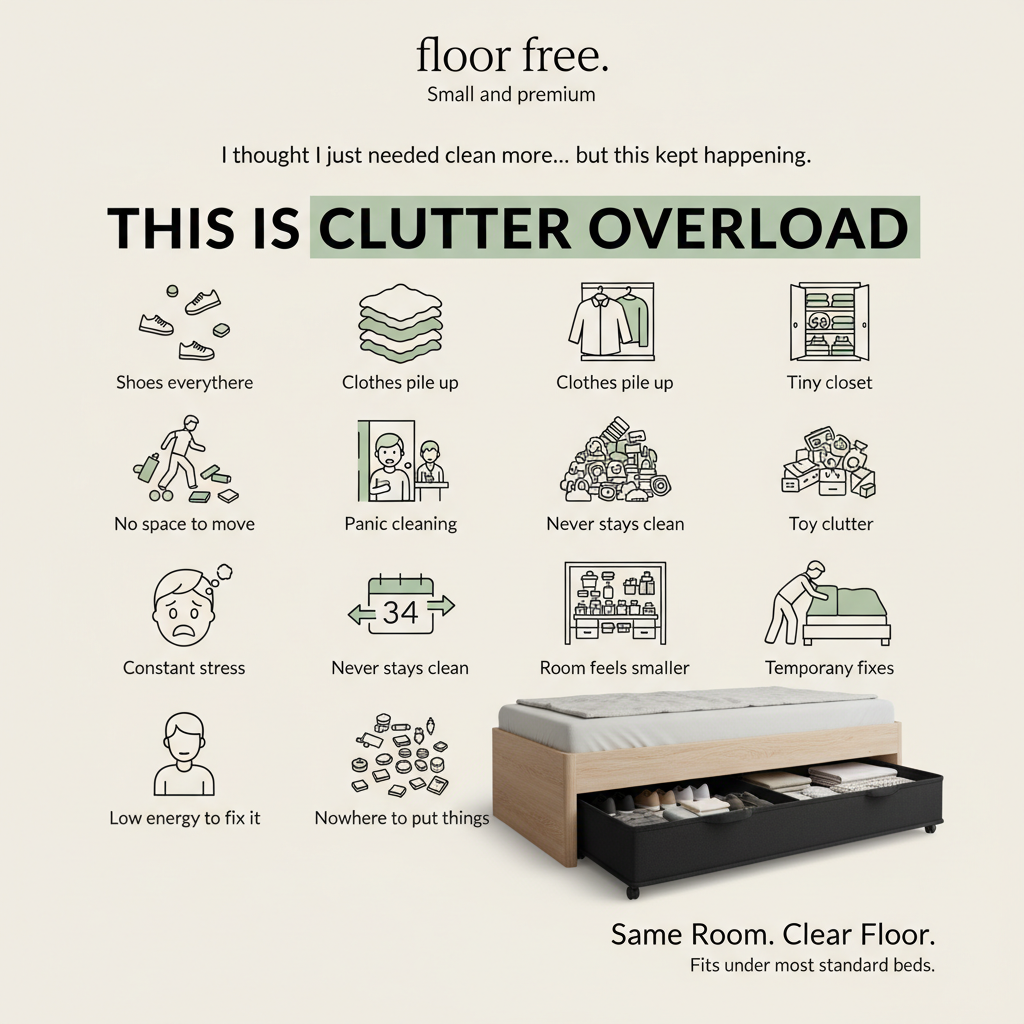Clothes, shoes, and random items pile up — turning your room into daily stress.